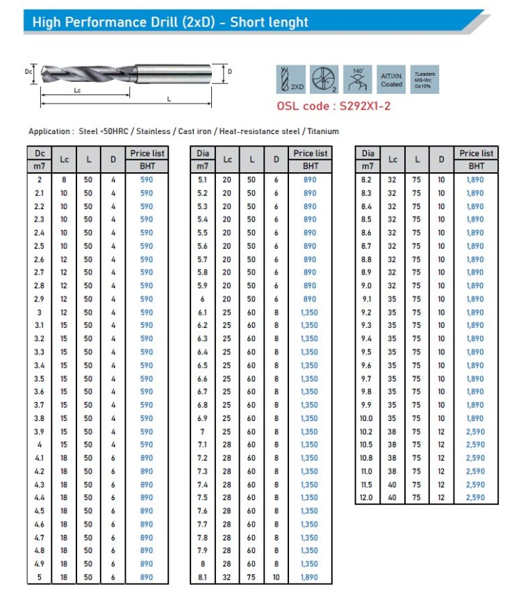 OSL Model: S292X1-2 ดอกสว่านคาร์ไบด์คมตัดสั้น 2xD